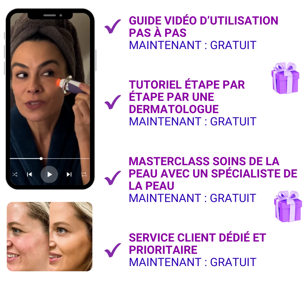 💜 Votre coffret DermaWave® Pro Lift réunit tout ce dont vous avez besoin pour transformer votre peau, grâce à des instructions claires, étape par étape — en toute sécurité, facilement et sans quitter votre maison.